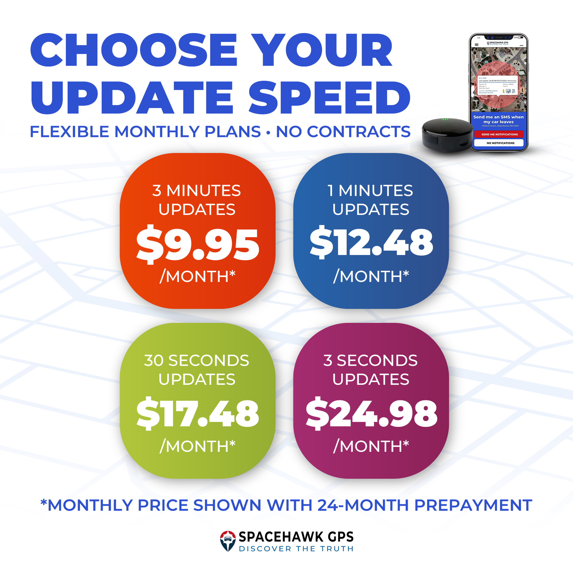 All subscription plans are month-to-month with no contracts! Cancel service anytime with a simple phone call! GPS data plans are as affordable as $9.95 per month with commitment.